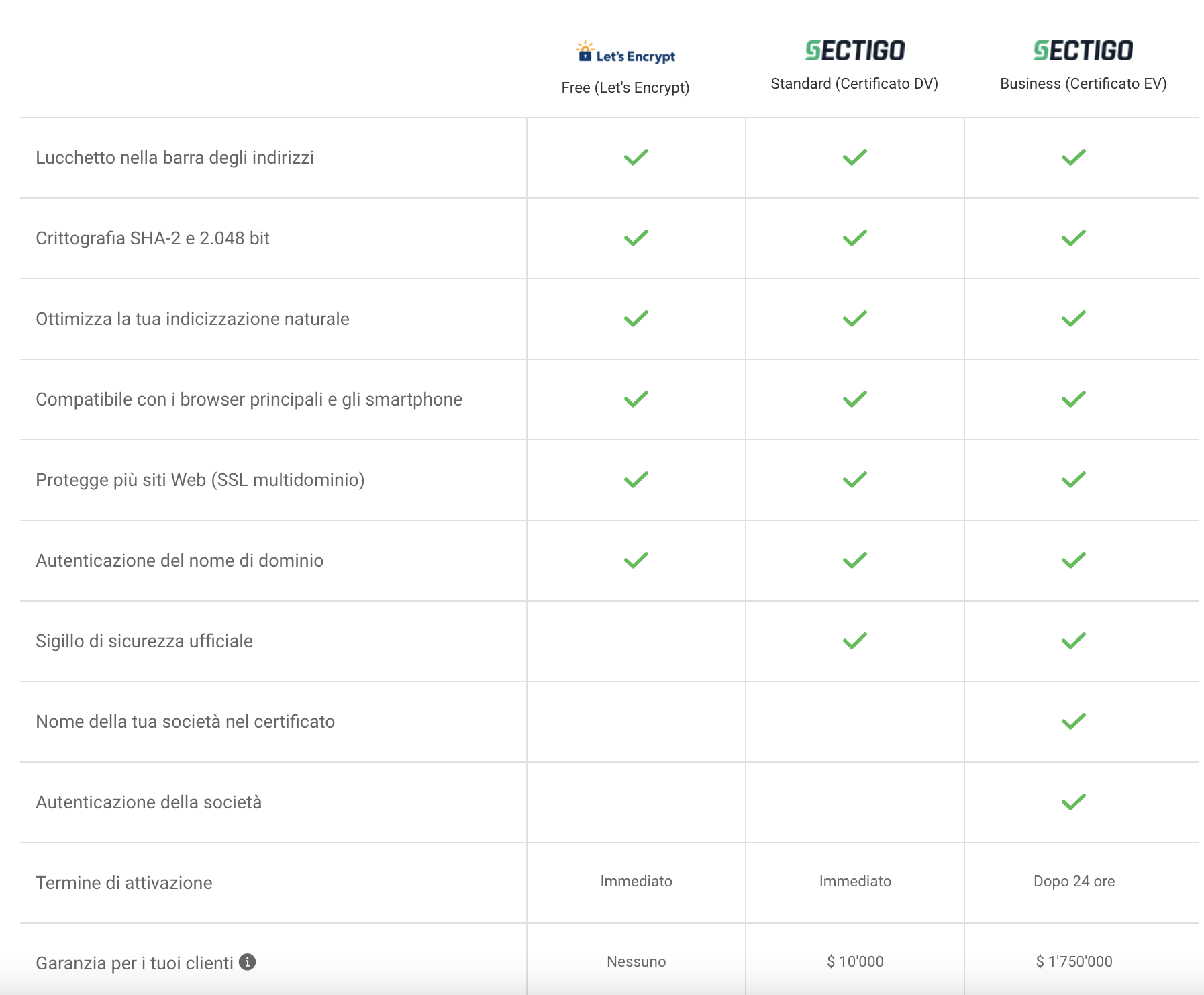 Certificati SSL Sectigo Standard Certificat DV (garanzia e convalida medie) e Certificati SSL Sectigo Standard Certificat DV (garanzia e convalida massime): Prezzi e condizioni in basso alla pagina.